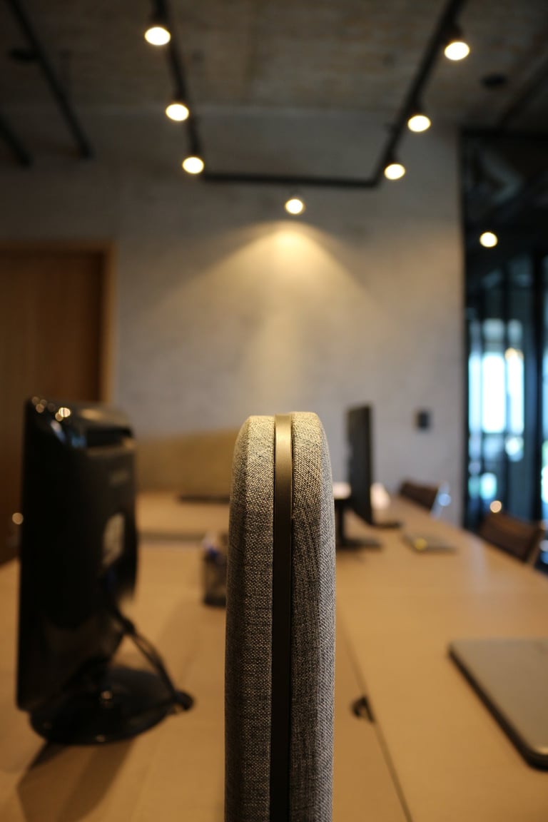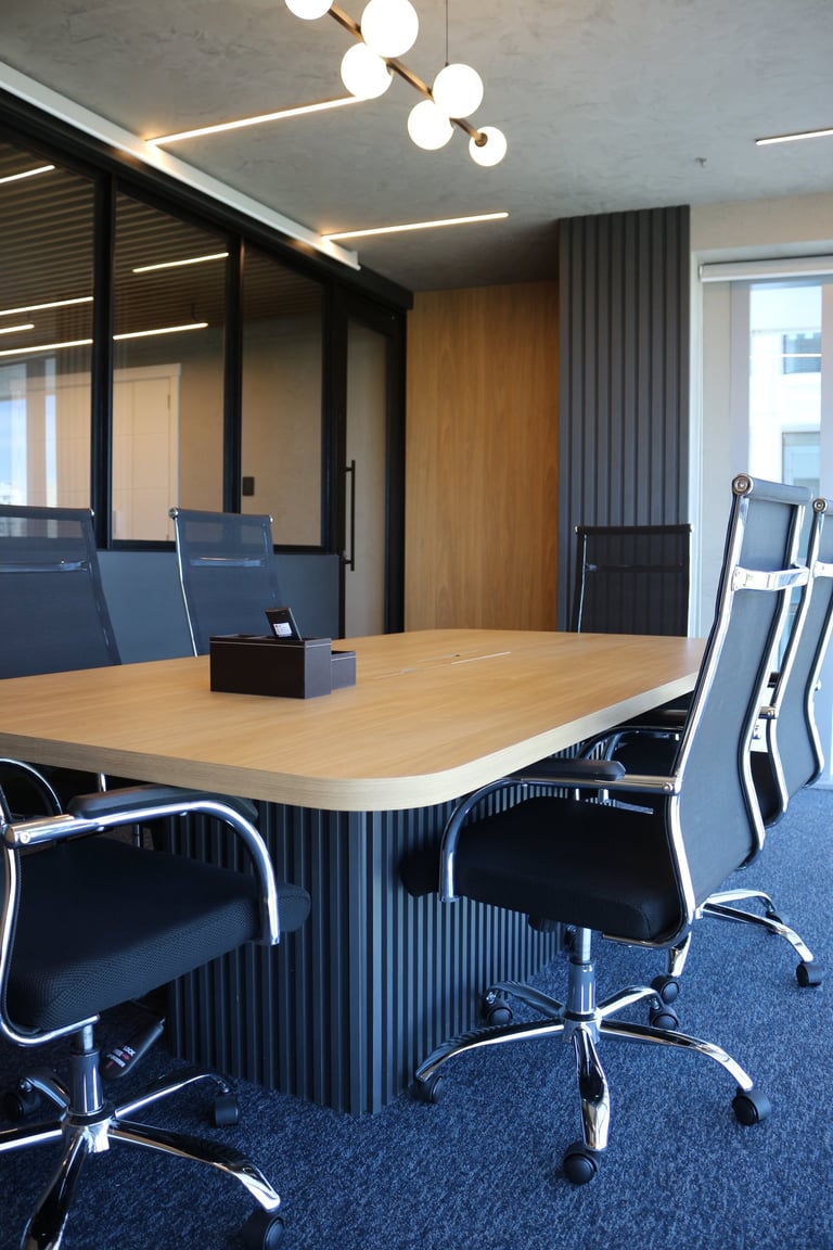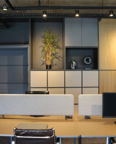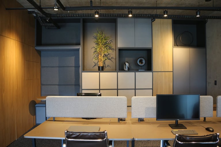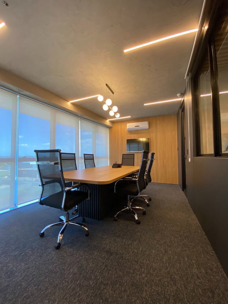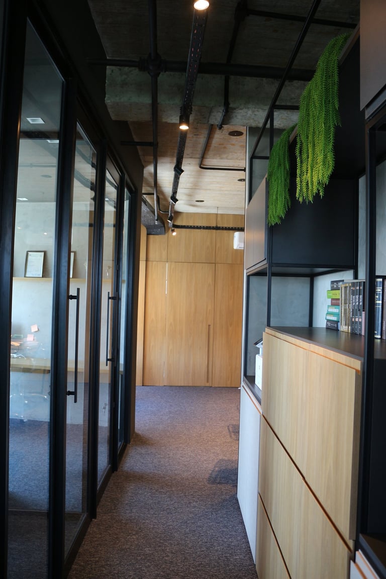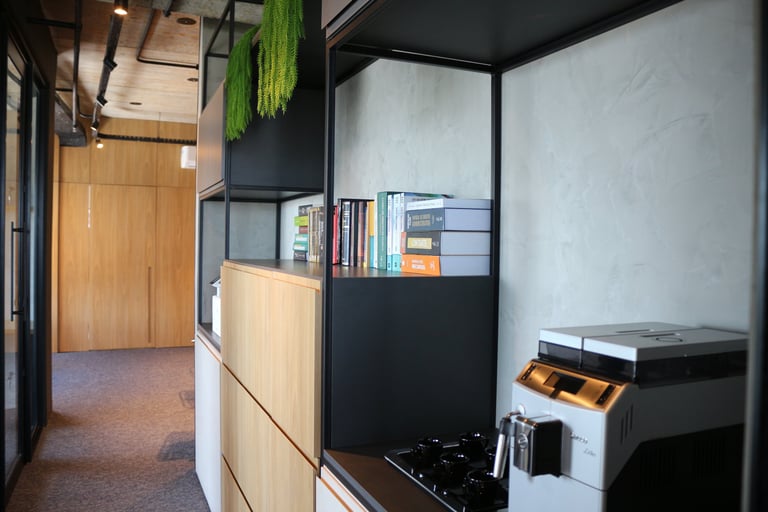 A linguagem do projeto é contemporânea, prática e alinhada à identidade visual do escritório. Os materiais, texturas e cores foram escolhidos para transmitir seriedade, incentivar a produtividade e manter o ambiente leve e funcional.