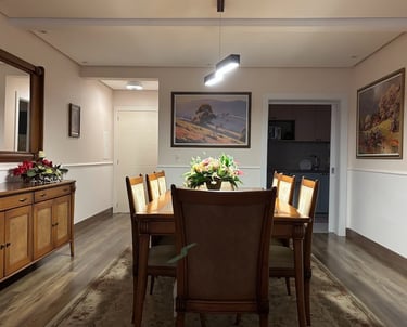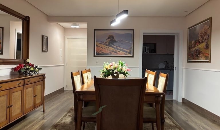 aqui a sala preserva memórias com móveis antigos, enquanto a cozinha colorida revela a vista mais bonita do apartamento.